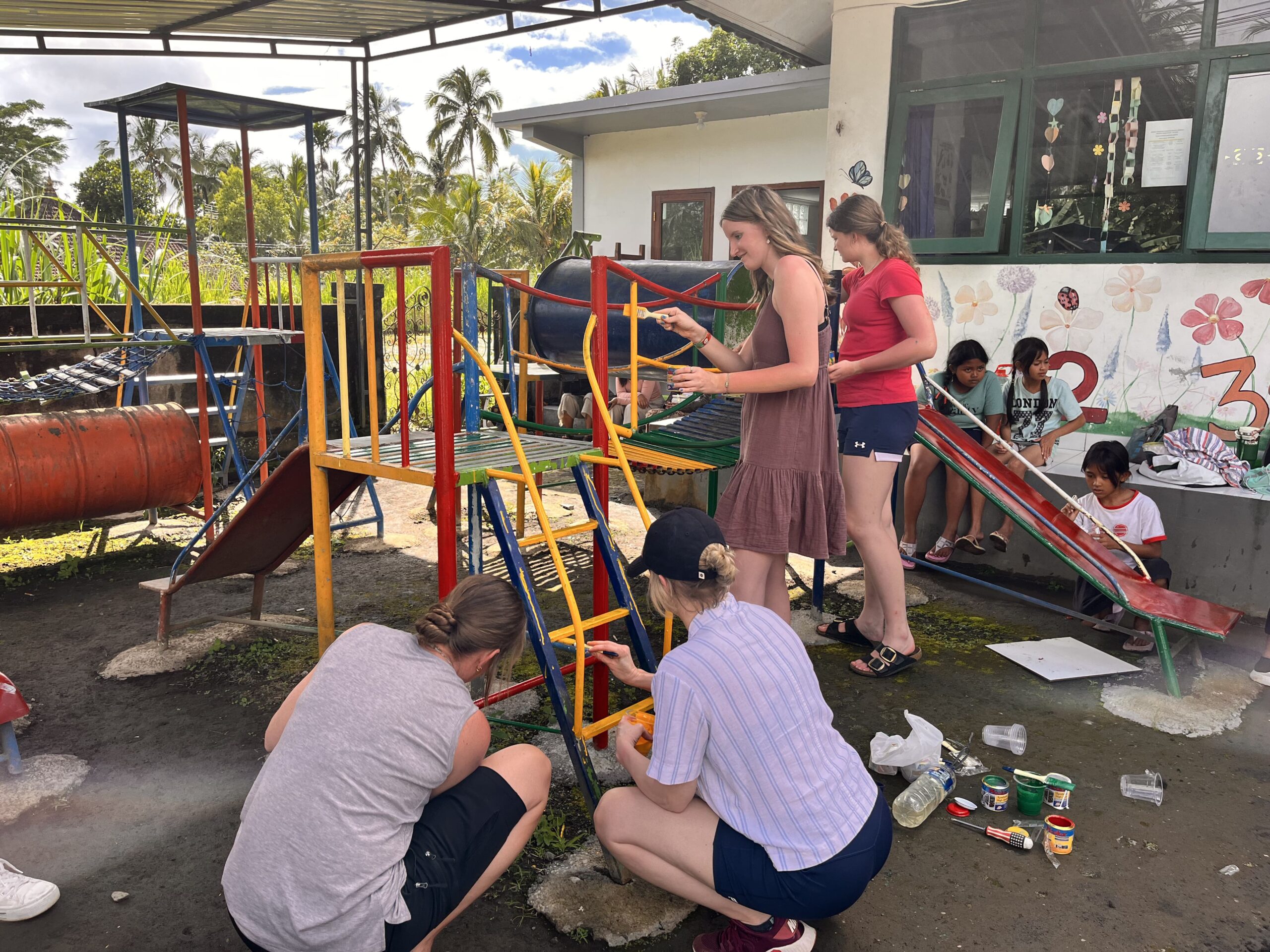 Volunteers worked together on outdoor improvements, including preparing and installing paving and refreshing playground equipment with new paint. These small but important efforts help create a safer and more welcoming environment for young students.